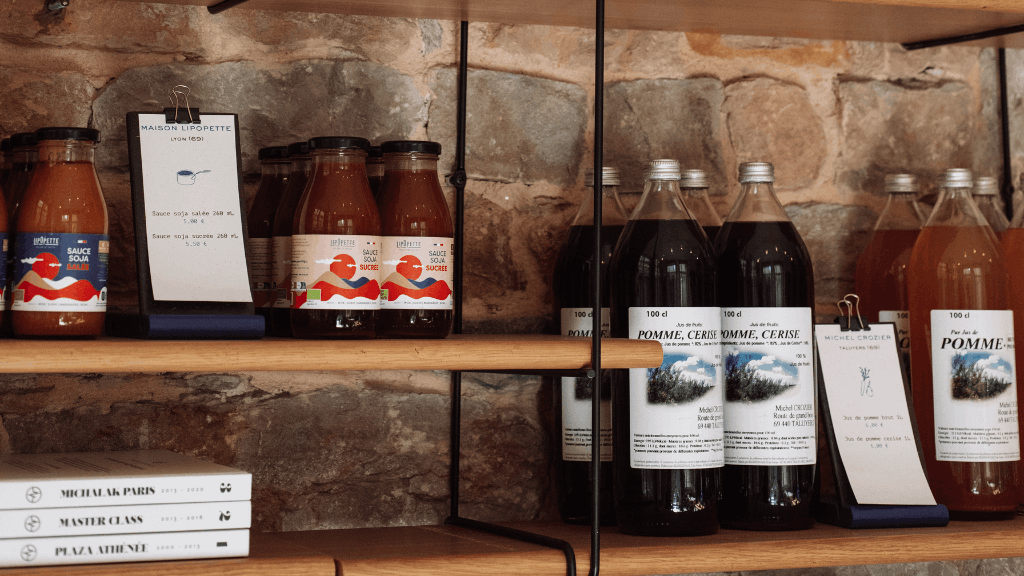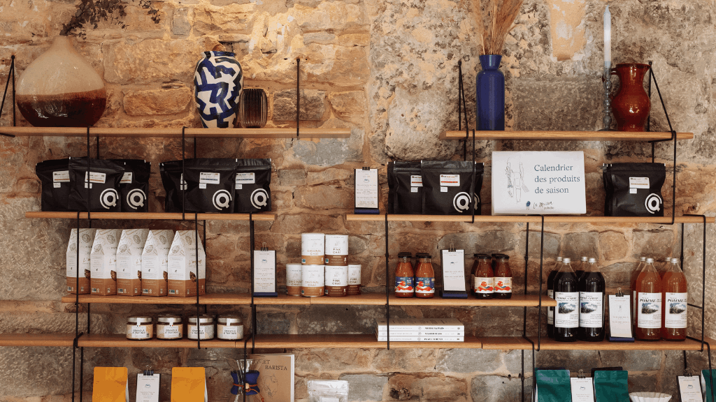 Un étalage avec une sélection des produits de nos producteurs et fournisseurs locaux, pour vous permettre de déguster leurs produits également chez vous.
